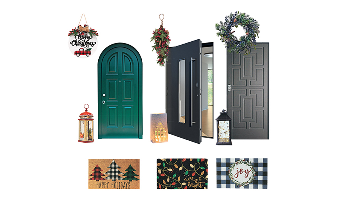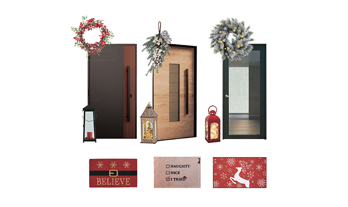 Porta ThermoSafe Decoral [Hörmann]. L'abbiamo abbinata a: ghirlanda a goccia Pine Foliage [Ginger Ray, cm 50h], lanterna Church Scene [Konstsmide, cm 29h] e zerbino Zizi [Mad About Mats, cm 75x50].