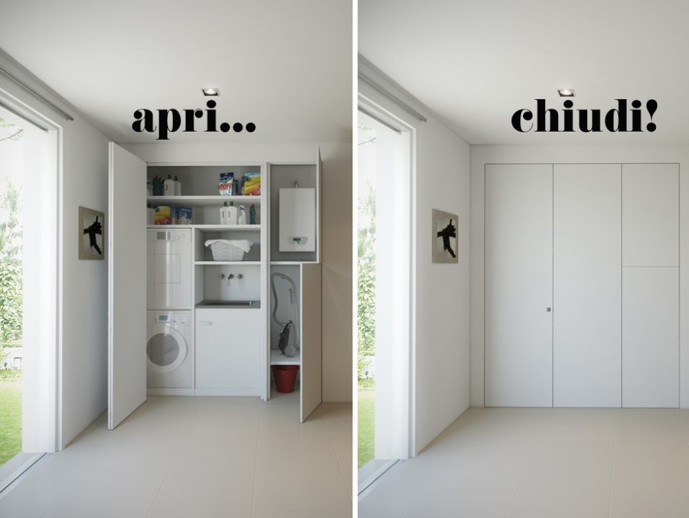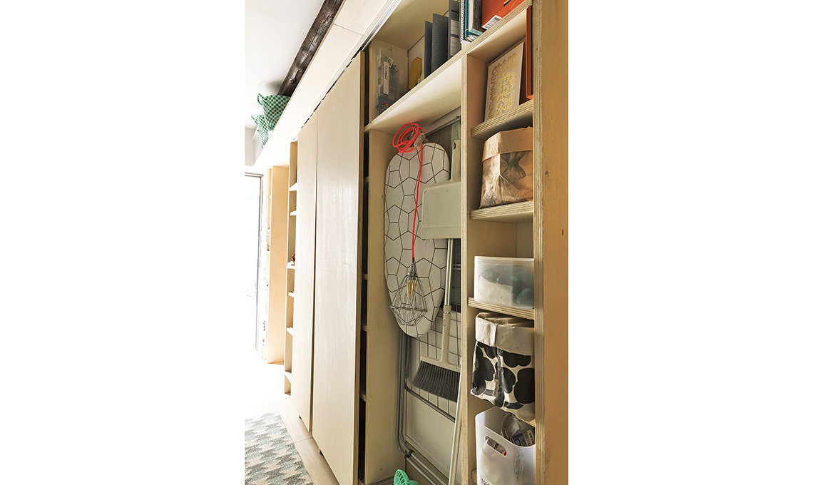 Per questo progetto, ad esempio, l'armadio su misura è profondo solo 23 cm, lasciando 90 cm per il passaggio in corridoio. Sono state usate lastre in multistrato spesso 22 mm per le spalle e spesse 20 mm per ante le scorrevoli (che nascondono le zone di servizio) e le ante a battente. All’interno, oltre a libri e accessori, ci sono scope, detergenti, asse da stiro, stendino per i panni e scarpe.