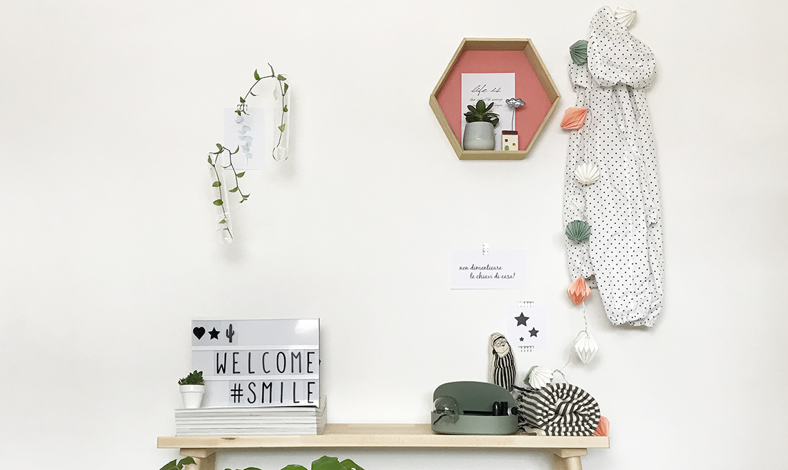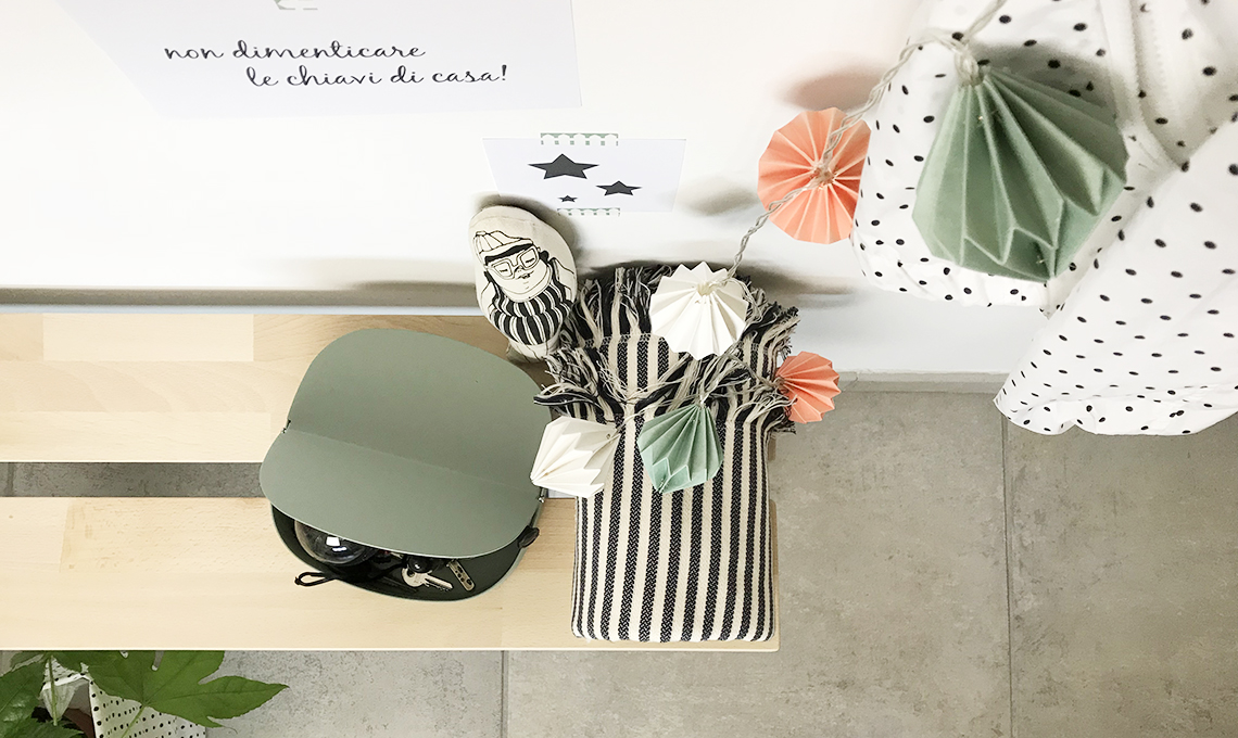 - una panca può essere quell’arredo stiloso e funzionale dal mood un po’ nordico, per dar carattere alla parete, e delle scatole porta oggetti ci aiuteranno a tenere più in ordine le cose;