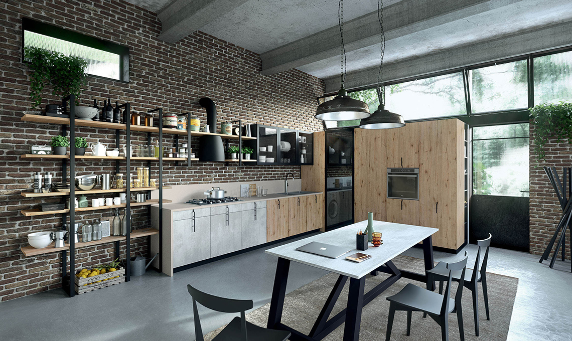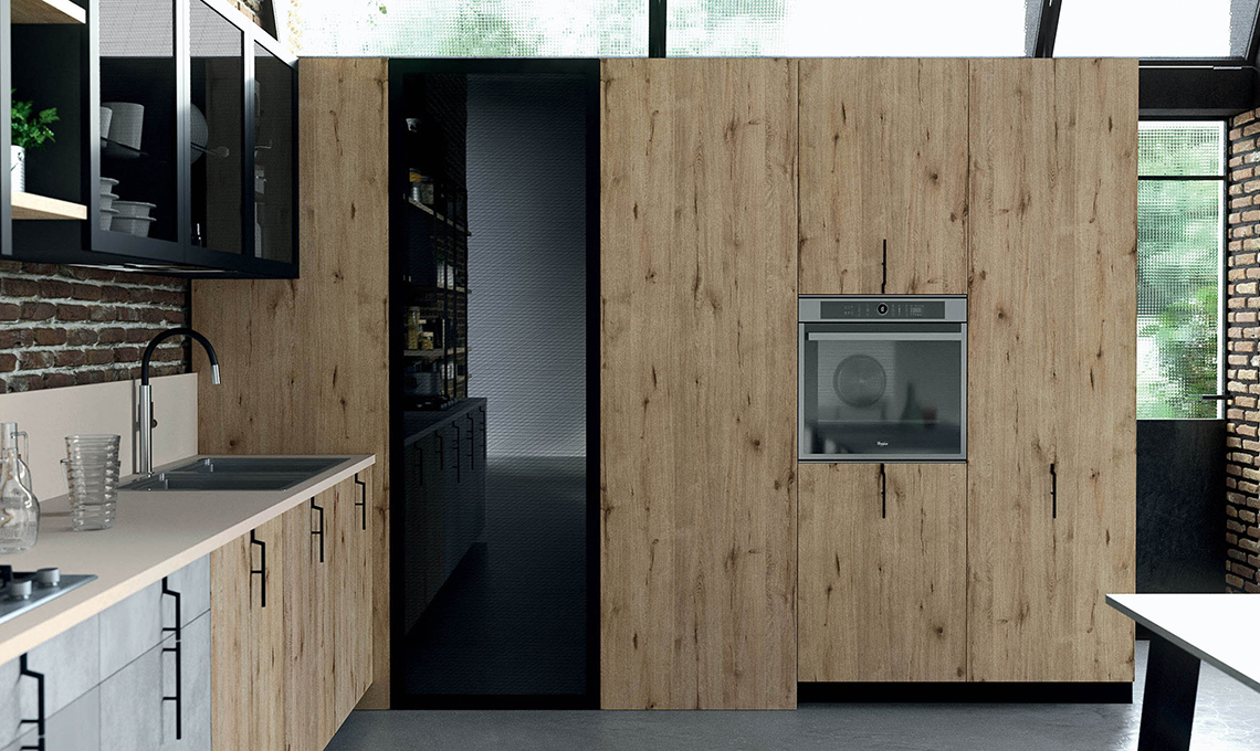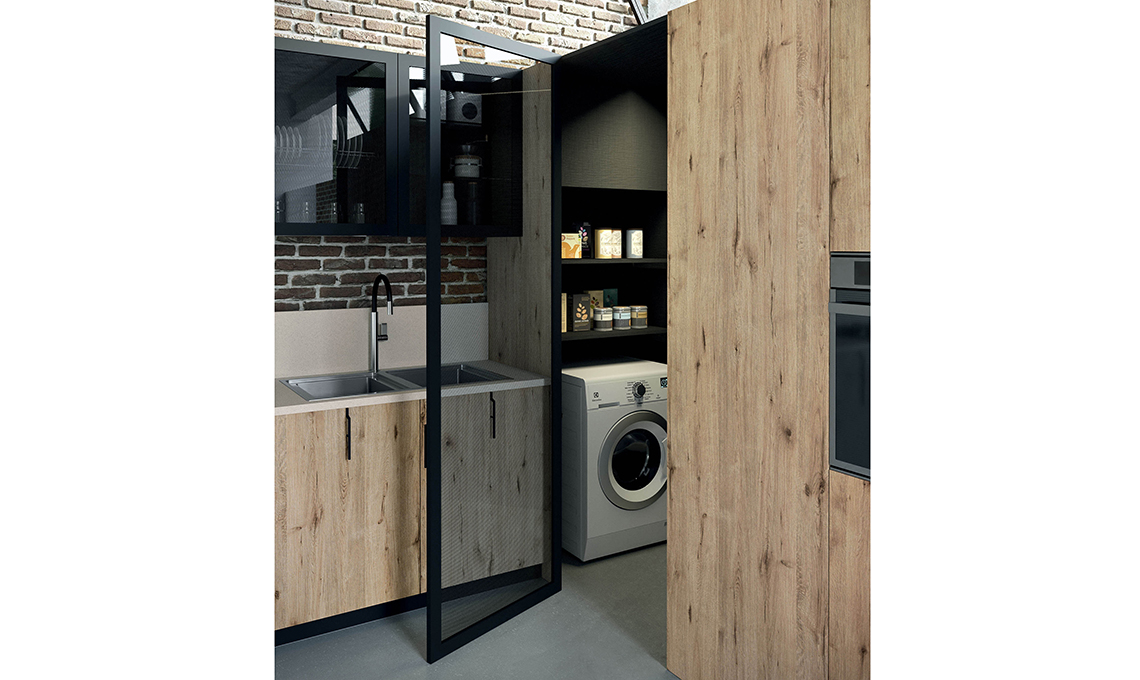 Lab13 Garage di Aran Cucine, in questa versione con cabina angolare multiuso, ha l’anta plana in finitura rovere Nuova Zelanda e beton, con maniglia dal mood industriale che si ritrova nella cappa, nel telaio in ferro fill nero che sorregge le mensole dal forte spessore e nell’anta con vetro- tessuto scuro che chiude la cabina.