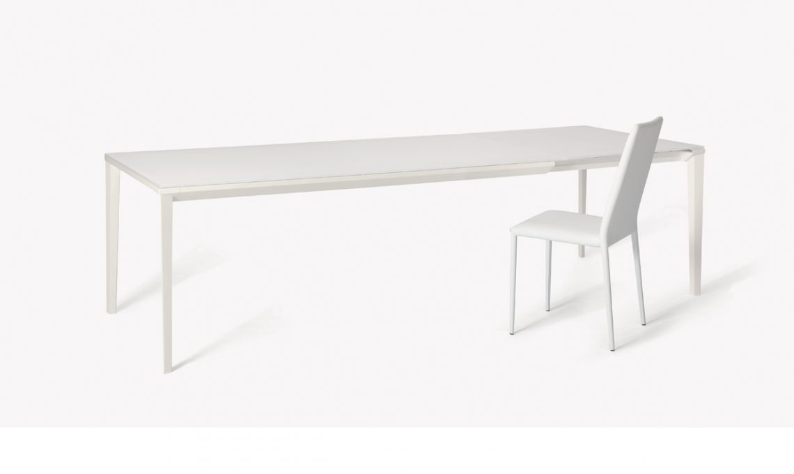Accoglie fino a 12 persone il tavolo allungabile Echo in acciaio laccato più top in cristallo velvet antigraffio, qui con la sedia Malik in acciaio ed ecopelle tutto in bianco [Bontempi Casa, cm 100x190/270x75h da €1.733 e €178,80].