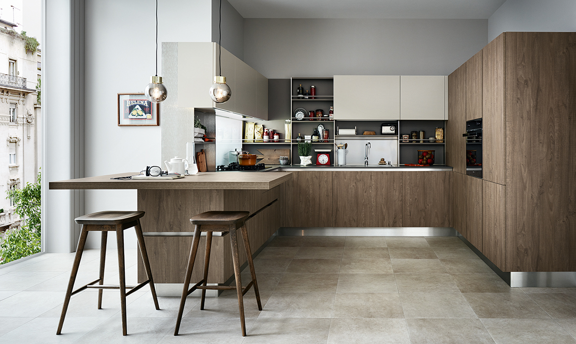 Per questo Veneta Cucine ha sviluppato il programma modulare Stepsystem, qui inserito nella cucina Ethica.Go, che non solo consente di creare elementi a tutta altezza con ripiani dotati di barra anticaduta, ma anche di sfruttare lo spazio inutilizzato tra base e pensile con boiserie attrezzata in modo da poter tenere a portata di mano tutto ciò che serve per cucinare.