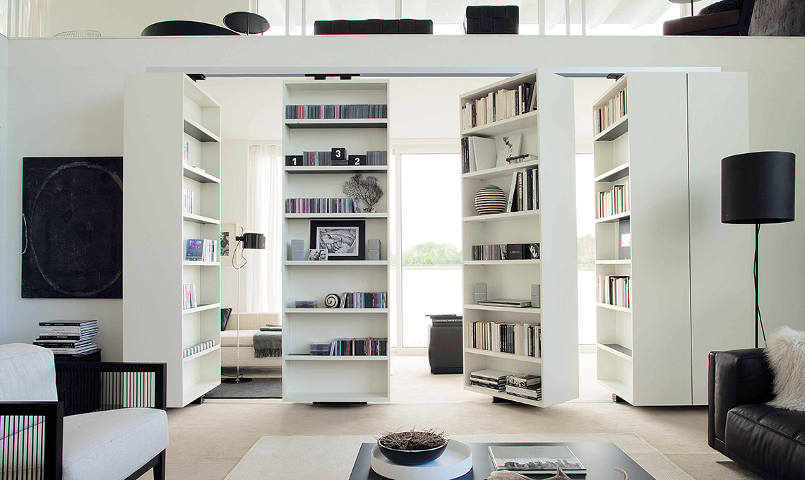 Apri e chiudi: vuoi dividere solo quando serve? I moduli libreria rotanti e montati su binario si possono girare di ‘taglio’ e accostare lungo i muri laterali per essere ‘richiusi’ quando vuoi tu.