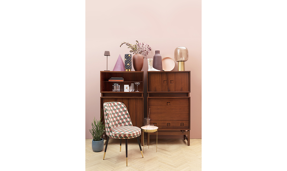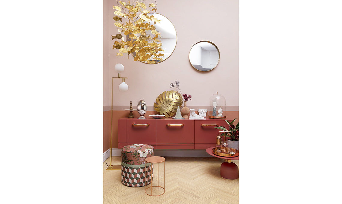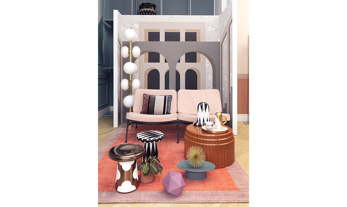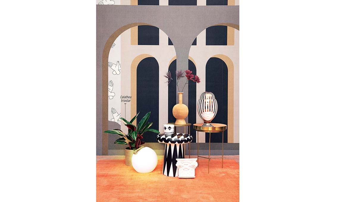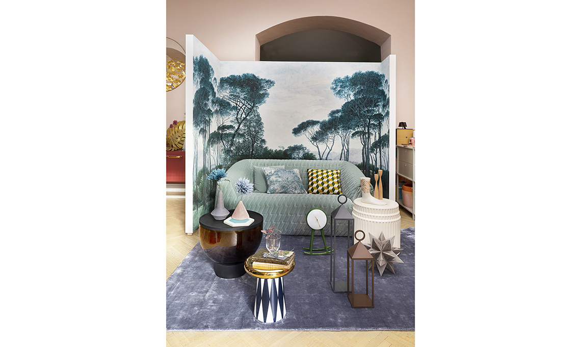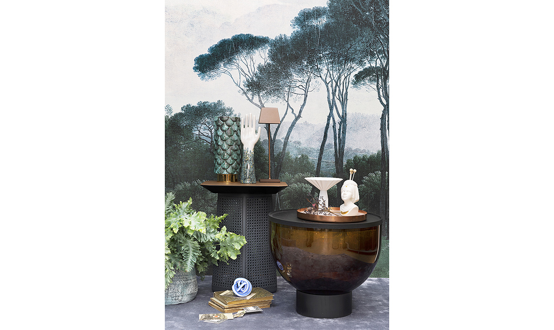 Siamo partiti dalle wallpaper: un paesaggio ottocentesco e una veduta più contemporanea con cenni di architetture (racconta Elisabetta Viganò). Da qui le palette colore - tutte le sfumature del rosa e i toni cupi del verde – sono state declinate sugli oggetti. Li abbiamo scelti ironici, evocativi e curiosi e li abbiamo messi in mostra su un mix di tavolini. Ricordando una regola base dello styling: mixare materiali diversi, ceramica, legno, vetro, marmo, legati, però, dal colore.