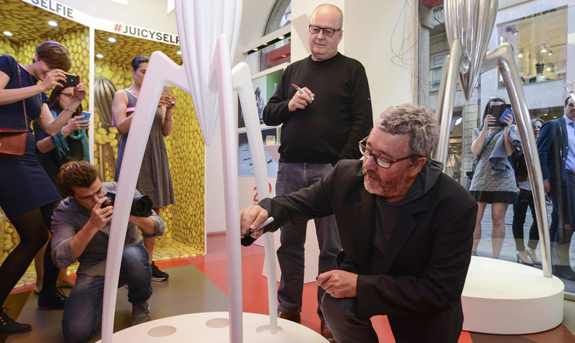 Le cronache narrano che Alberto Alessi chiese a Starck un vassoio. Philippe, in vacanza al mare con la famiglia, chiedendo del limone per condire una frittura di pesce, disegnò di getto su una tovaglietta di carta (conservata oggi al Museo Alessi di Omegna) questo curioso ‘ragno spremitore’. E lo spedì ad Alessi, contro ogni brief o modalità. Non ha manici, non ha serbatoio. Presuppone una precisa interazione dell’utente. Ma come una chitarra con la tastiera storta e con alcune corde non proprio perfette al capotasto, Juicy Salif ha un suono, una timbrica, persino una pastosità sonora e visiva che lo ha fatto diventare una scultura, al limite della sacralità. Presente in ogni casa e in ogni paese.