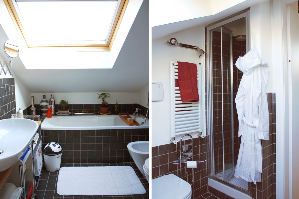 Il bagno è il mio piccolo gioiello: ci ho messo sia la vasca, dove il tetto è più basso (ma sul lato esterno l'altezza è di 140 cm ) sia la doccia in una nicchia accanto alla porta. Per non appesantire visivamente il locale ho posato le piastrelle ad altezze diverse: 120 cm dietro il lavabo, 70 cm lungo vasca e sanitari, 180 nella doccia.