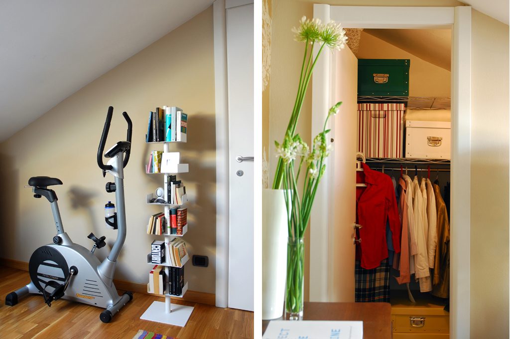 L'atmosfera è unica e gli ambienti sfruttati ad hoc. La falda del tetto inclinata ha stimolato la mia creatività per dare vita a una casa che fosse calda, accogliente e, allo stesso tempo, utilizzata al centimetro. Così, oltre a giocare con i colori, ho organizzato le varie stanze proprio in funzione delle diverse altezze del soffitto. Le librerie sono lungo la parete più alta, i piccoli contenitori lungo il perimetro. Le chicche? Prima di tutto la cabina armadio gigante ricavata semplicemente chiudendo un lato della camera (realizzare un armadio su misura sarebbe costato molto di più) e poi il bagno: nella parte bassa ho posizionato la vasca (mai vi avrei rinunciato!) e in quella alta la doccia (più pratica in estate).
