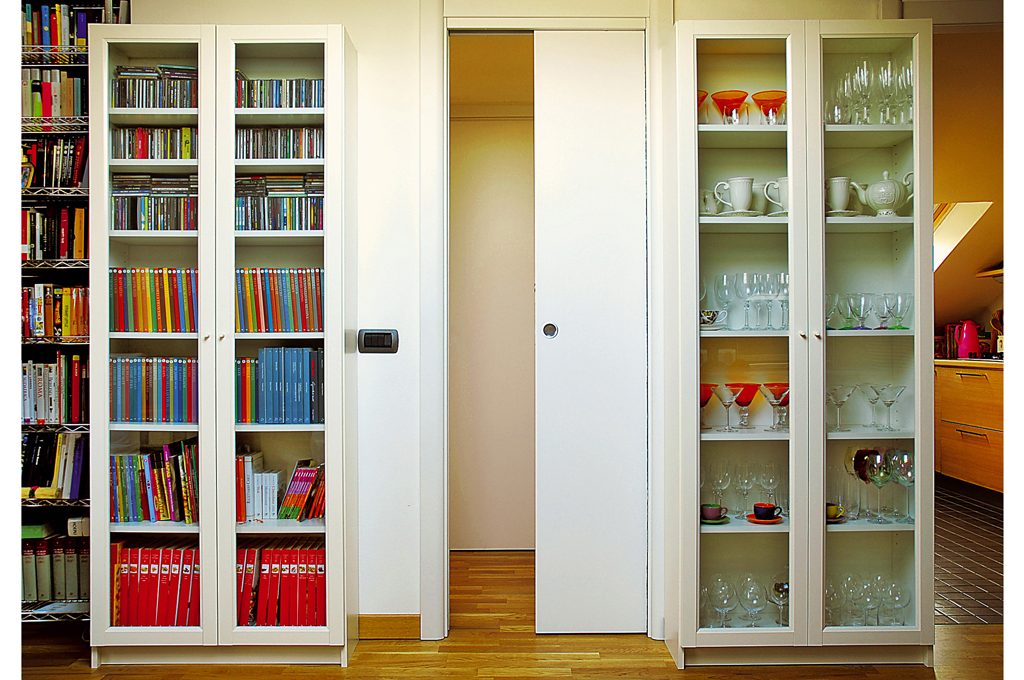 La mansarda è molto affascinante ma bisogna sfruttarne al meglio lo spazio: il muro che separa le zone giorno e notte l'ho attrezzato con due vetrine dove ho sistemato tutti i miei bicchieri (li colleziono), i cd più i libri d’arte e di cucina.