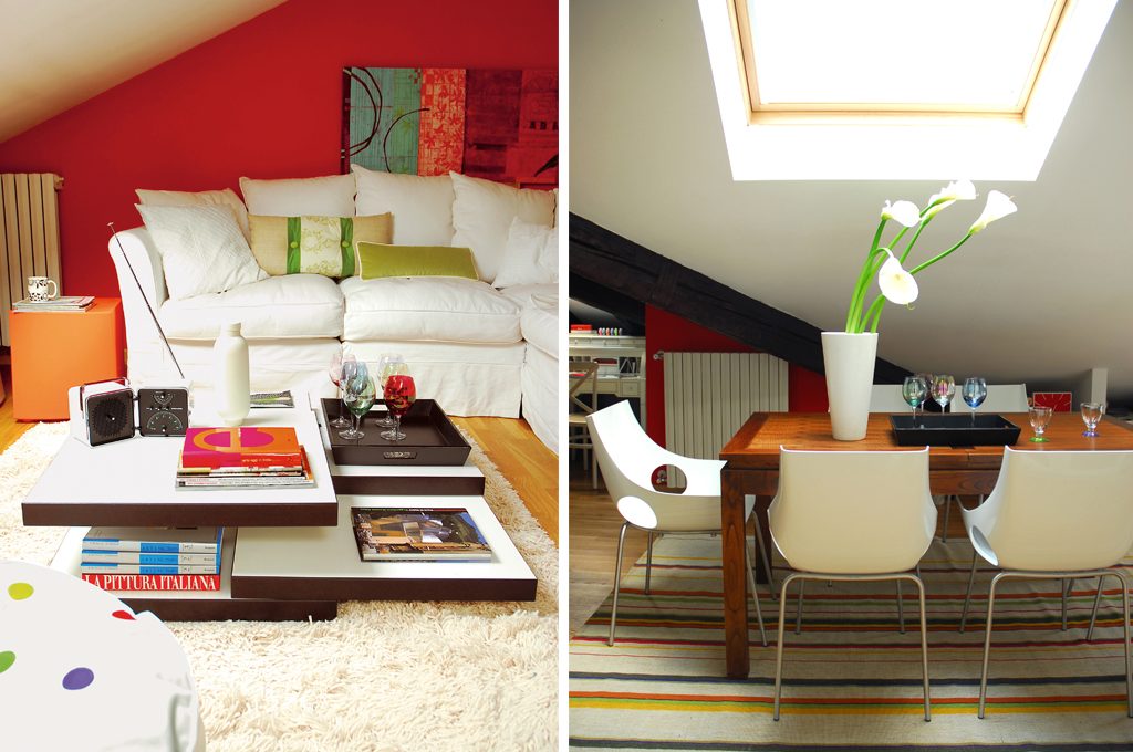 Adoro stare con gli amici: la zona giorno è abbastanza grande per accogliere un maxi divano angolare da sei/sette posti più dei pouf e un tavolo allungabile in cui ci stiamo anche in otto/dieci. La parete rossa sul fondo mitiga la grande luminosità della stanza e riproporziona il locale.