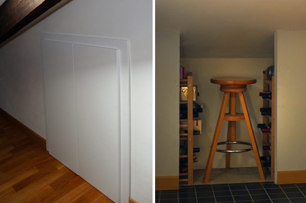 Soluzioni sfrutta-spazio: accanto allo studio c'è un grande ripostiglio che ho chiuso con una porticina realizzata su misura; in cucina nella parte bassa oltre alla cantinetta c'è posto per il mio mitico sgabello che usavo quando andavo all'università per disegnare al tecnigrafo (ora mi serve quando faccio colazione).