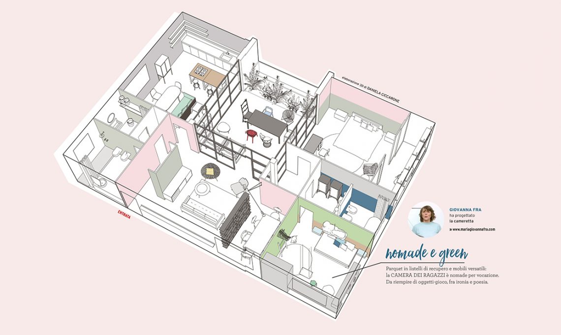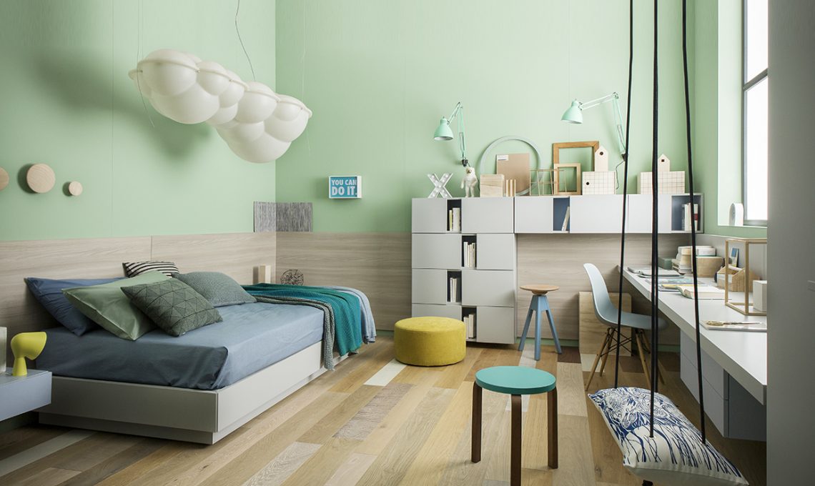 La stylist Giovanna Fra ha scelto per il pavimento della cameretta un parquet a listelli tutti diversi, ecologico e a km 0. «Questo pavimento grafico e dinamico è diventato lo ‘spirito-guida’ della stanza. L’ho contornato con un verde intenso (i ragazzi preferiscono le tinte forti!) e con arredi pensati per attraversare le età, perché è tempo di scelte che durino. E ho aggiunto degli sgabelli, sono oggetti nomadi (li trascini dove vuoi) e multitasking (seduta e tavolino), li considero una forma di libertà».