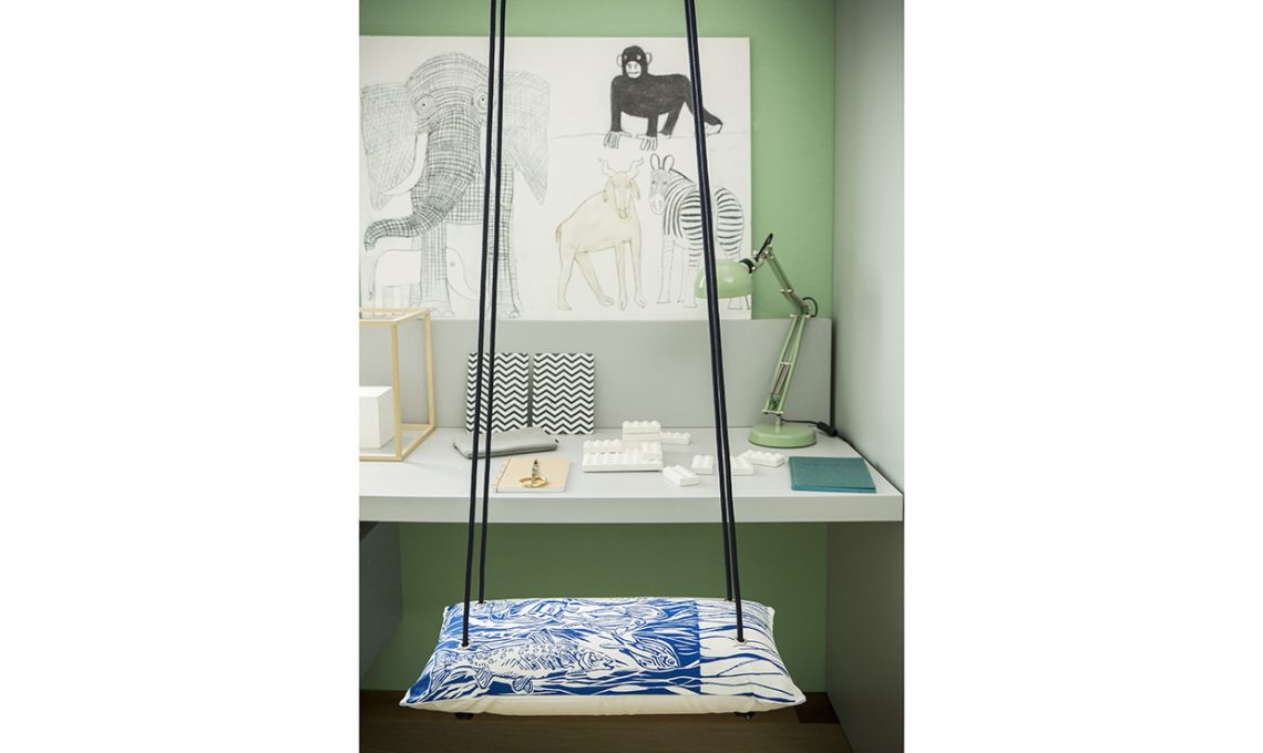 Per rilassarsi tra una materia di studio e l’altra, Giovanna ha pensato a un classico del relax, di solito outdoor, qui in versione da interno. È l’altalena Poisson con tiranti in corda nera e cuscino decorato con pesci [cm 70x35x250h max €219 su » baleinerouge.com]. Sul muro, serigrafia stampata su carta Moments of Ingenuity [Magis].