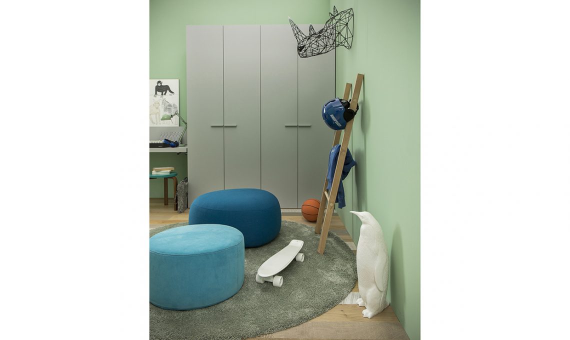 Ogni angolo è studiato per una funzione: relax, studio, condivisione. «Perché è in camera che i ragazzi concentrano tutte le loro attività» dice la stylist. «Con gli amici si siedono per terra a mo’ di tribù, quindi ho messo un tappeto rotondo e dei pouf colorati. Nei mobili, poi, tengono di tutto, li ho presi capienti e con antine per nascondere il disordine». Questi starebbero bene anche in ingresso, in cucina, in soggiorno: Giovanna li ha volutamente scelti così, immaginando che, una volta esaurito il loro compito nella camera dei ragazzi, possano vivere una seconda vita altrove.