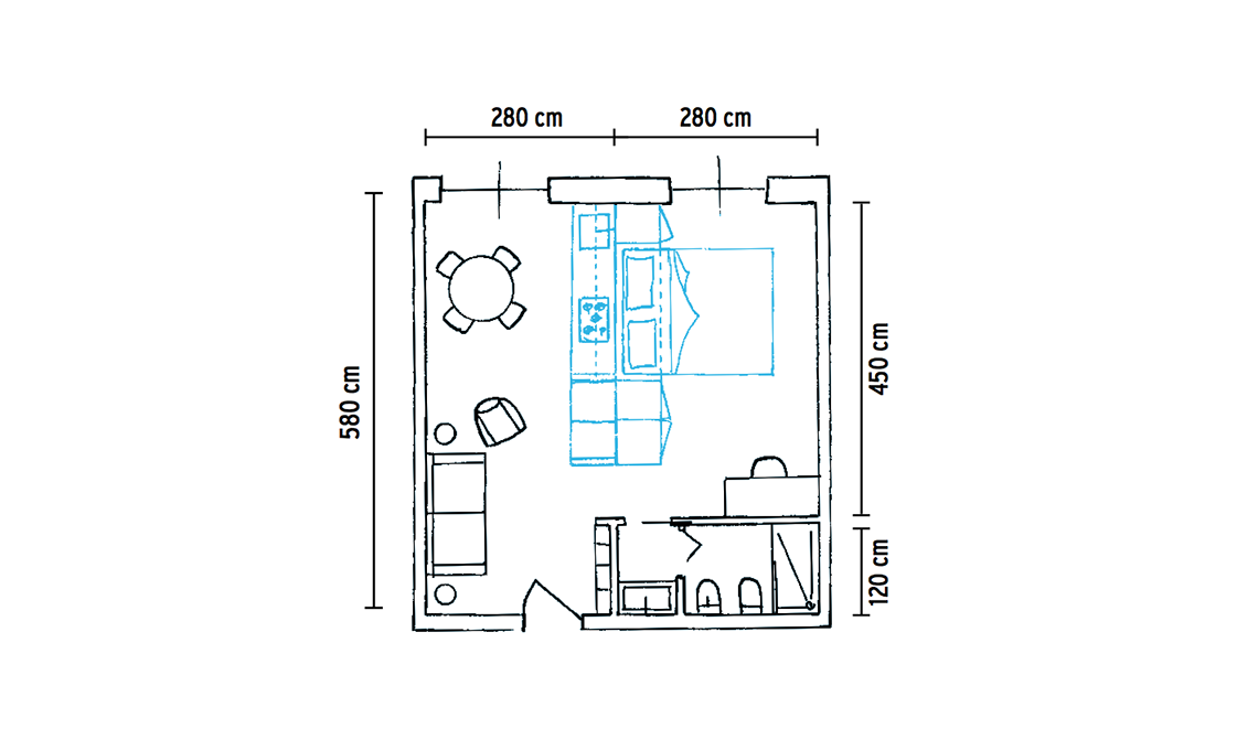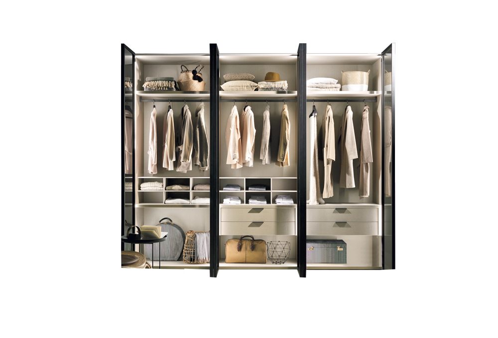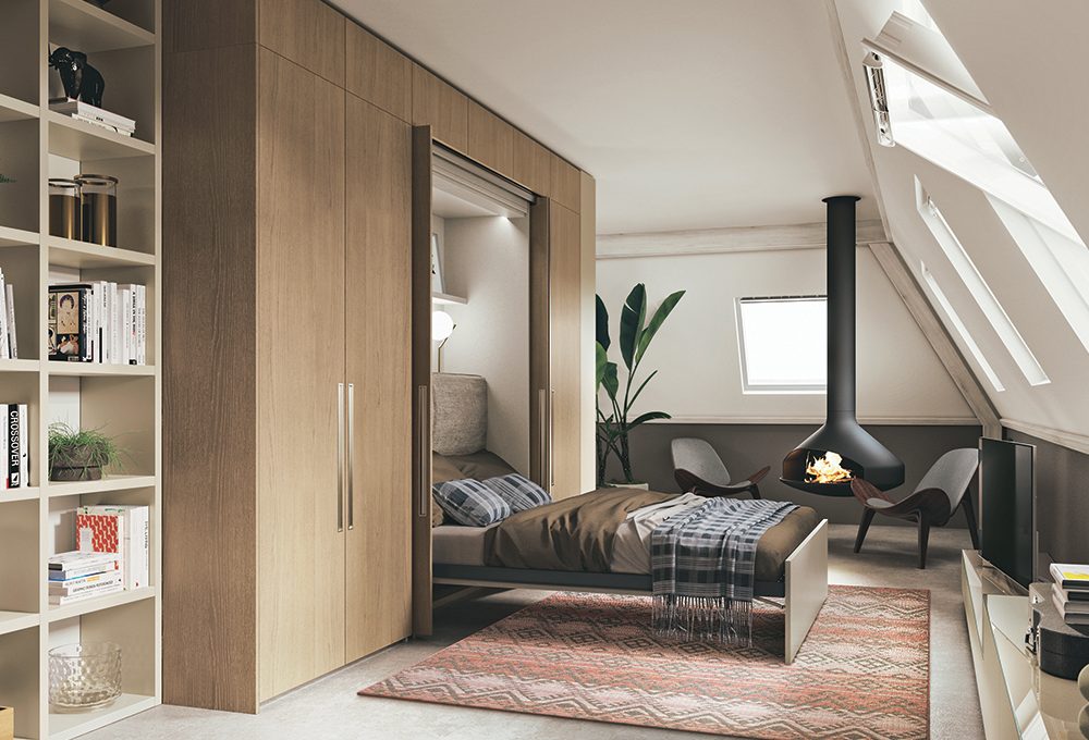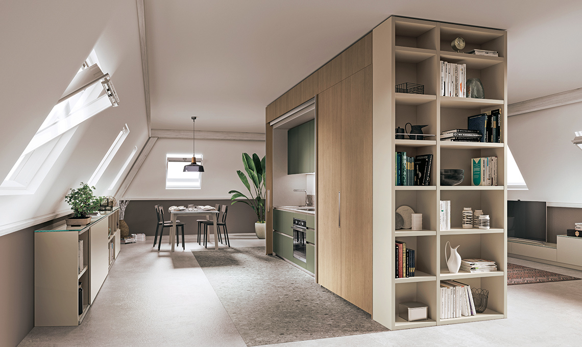 Per creare zone diverse sfrutta il centro con armadi da accostare schiena-schiena con diverse funzioni: da un lato la cucina, dall’altro il letto a ribalta e il guardaroba, così gli spazi si moltiplicano. Puoi realizzarlo con il sistema BoxLife che con ante ed elementi a scomparsa organizza gli ambienti in modo iper funzionale e ordinato [Scavolini].