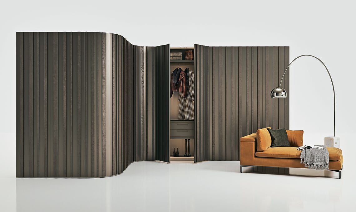 Per separare ingresso e living, puoi inserire un’armadiatura con moduli che si aprono su un locale o sull’altro alternatamente, in modo da servire entrambi gli ambienti. Gli schienali devono avere la stessa finitura delle ante per dare continuità. Un esmepio? Stave con doghe verticali, moduli curvi e apertura push pull [Novamobili].