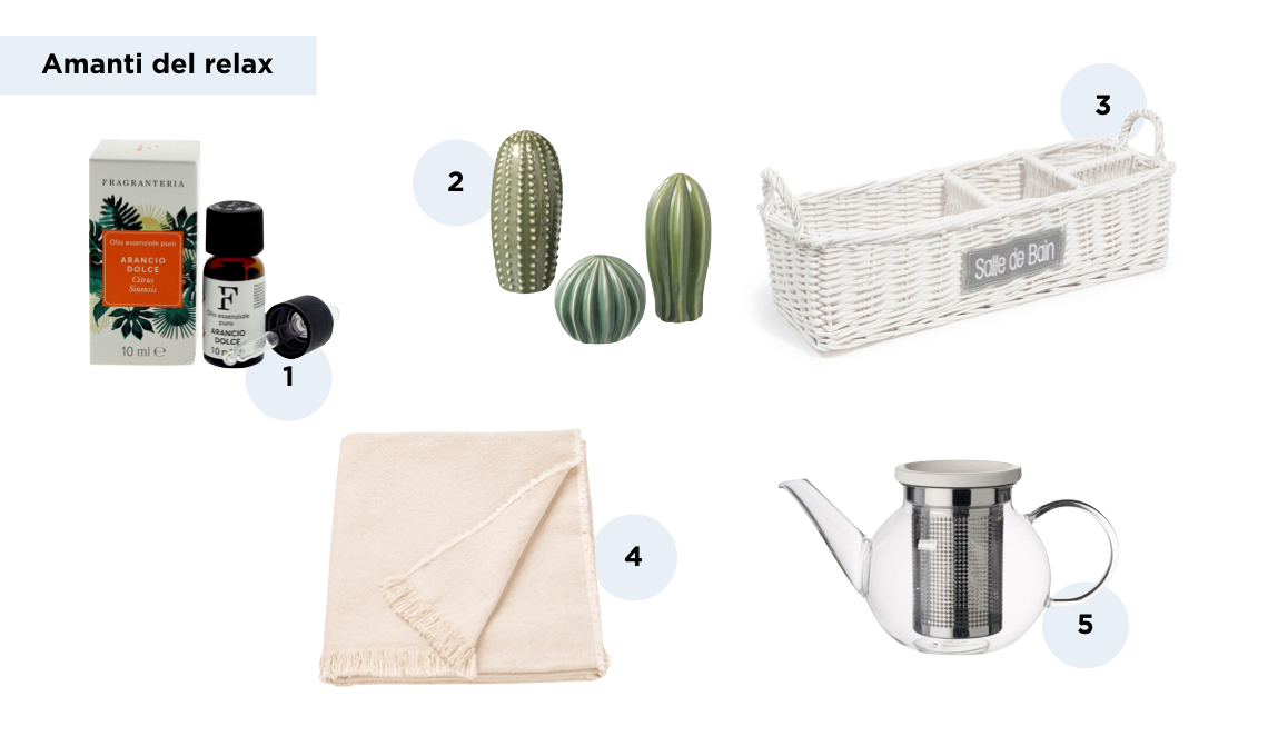1. Arancio dolce - olio essenziale puro [Tigotà, €6,50], 2. Själsligt - set di 3 decorazioni verdi [IKEA, €14,95], 3. Cestino da bagno in vimini sbiancato [Maisons du Monde €18,99], 4. Jofrid - Plaid, naturale [IKEA, €34,95], 5. Artesano Hot Beverages - teiera piccola con filtro [Villeroy & Boch €42,90]