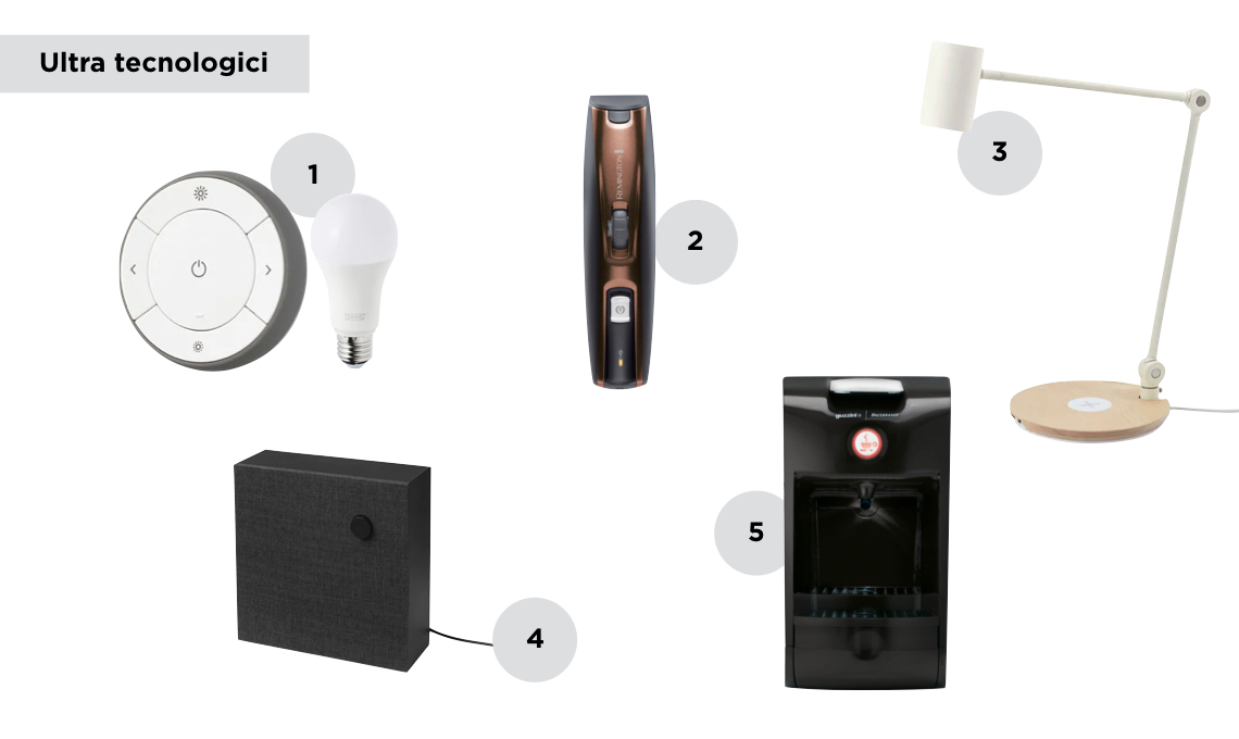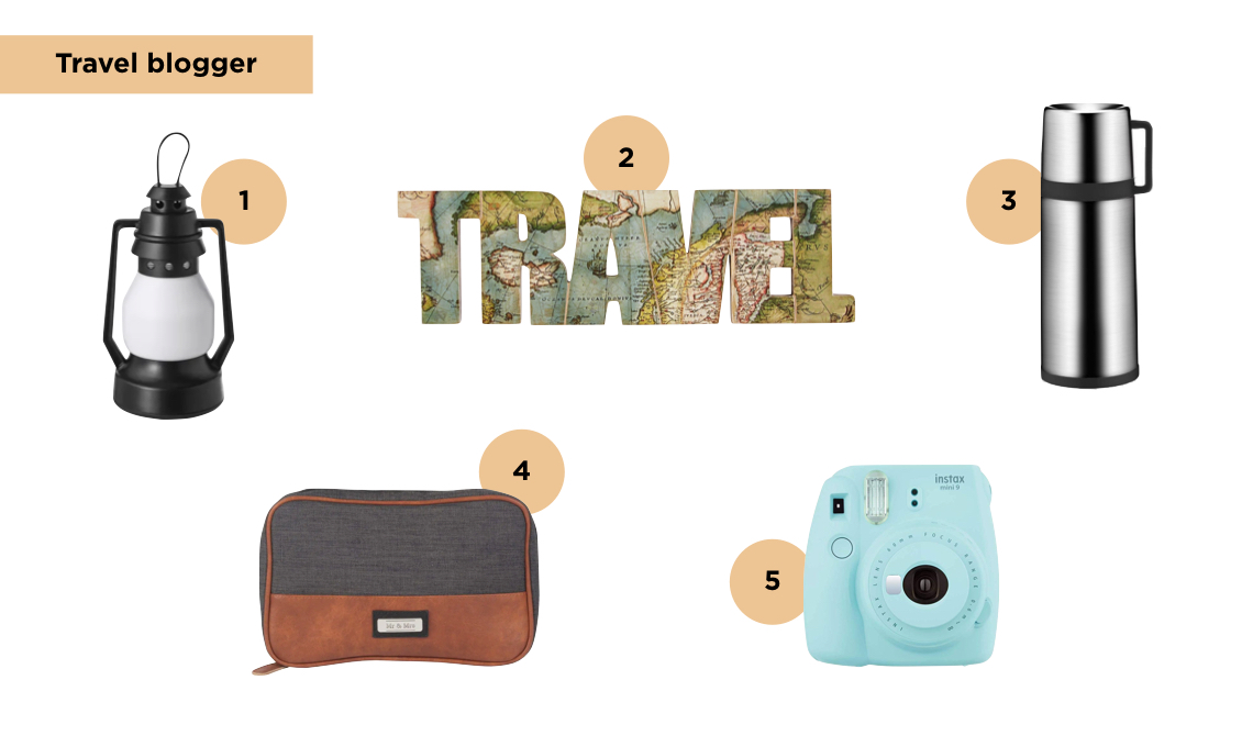 1. Vinter 2018 - Illuminazione decorativa a LED [IKEA €2,95], 2. Emma & John - Pochette per caricatori in cotone [Maisons du Monde €16,99], 3. Thermos in acciaio con tazza [Tescoma €21,90], 4. Travel - decorazione da parete [Maisons du Monde €39,99], 5. Instax Mini 9 Ice Blue [Instax Fujifilm €75]