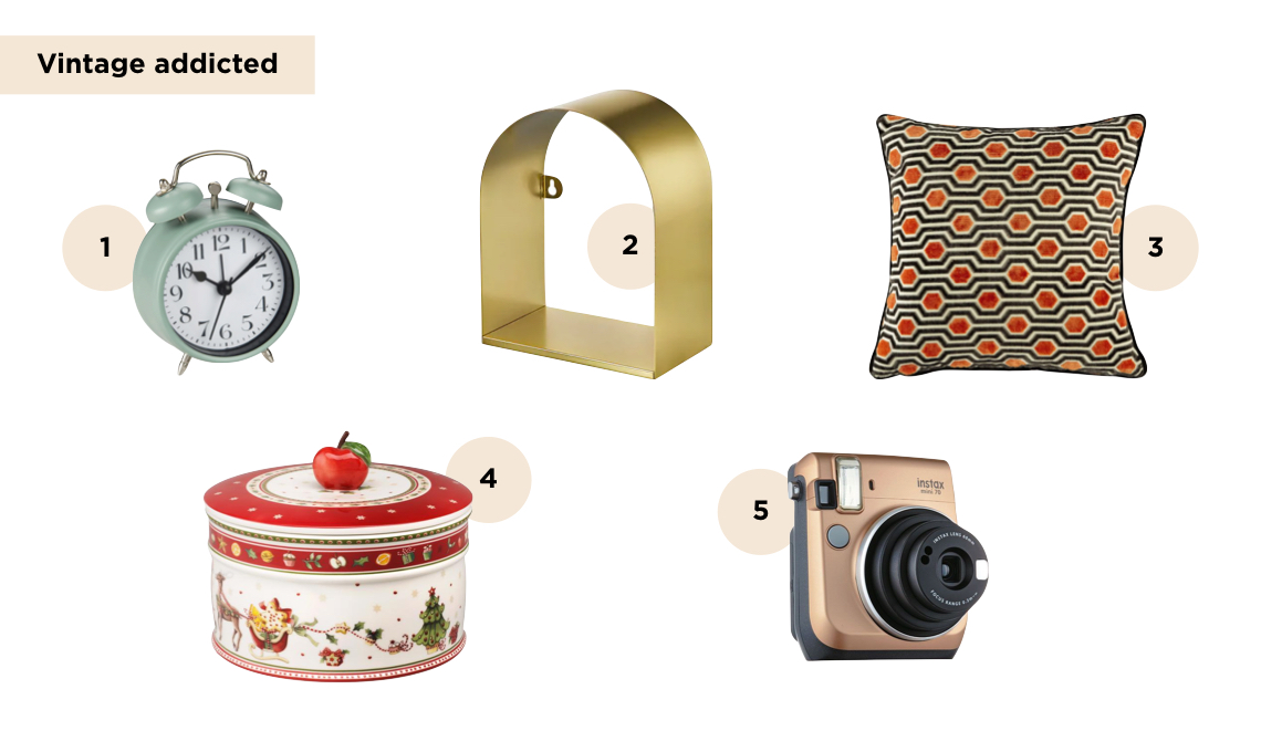 1. Arthur - Sveglia vintage in metallo verde menta [Maisons du Monde €8,99], 2. Tossåsen - Scaffale da parete color ottone [IKEA €12,95], 3. Art Déco - Cuscino in velluto 45x45 cm [Maisons du Monde €25,99], 4. Winter Bakery Delight - Scatola per pasticcini grande [Villeroy & Boch €49,90], 5. Instax mini 70 Stardust Gold (Instax Fujifilm €124,90]
