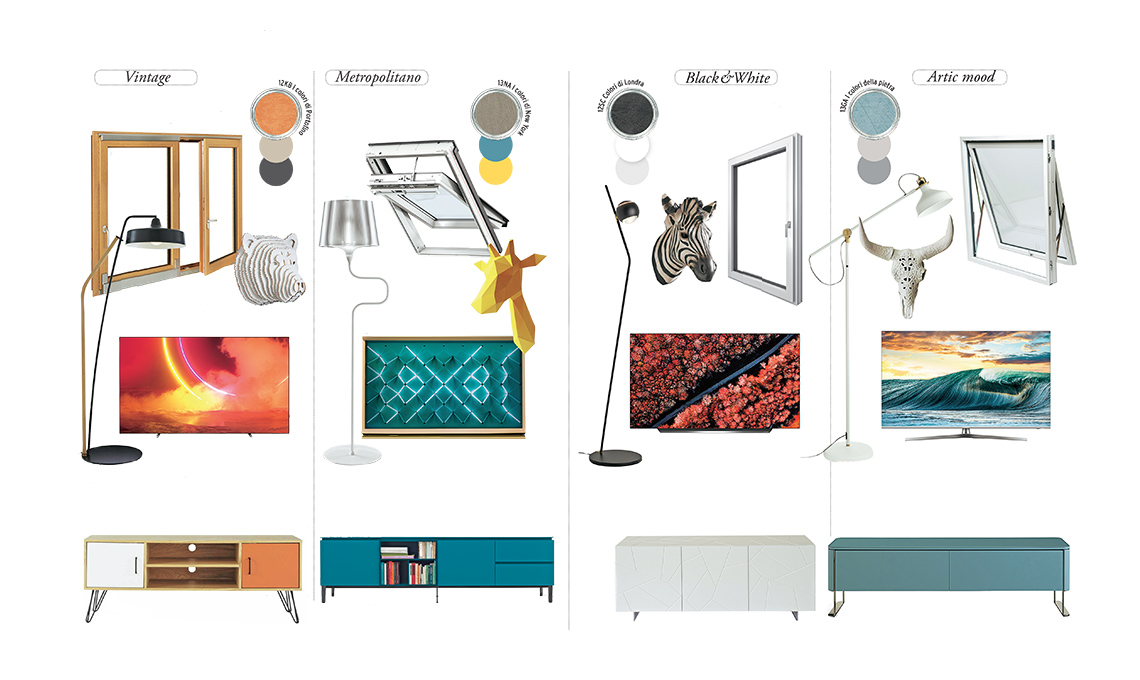 Stile vintage: finestra complanare scorrevole in pvc [Fossati Serramenti, prezzo su richiesta], lampada Spok [Ligne Roset, cm 222h € 896], trofeo orso [ADM, ø cm 31 € 78]. Televisore Smart TV Oled 805 [Philips]. Mobile tv Twist [Maisons du Monde, cm 130x38x50h € 160]. Stile metropolitano: finestra da tetto GGU Integra® Elettrica [Velux, prezzo da rivenditore], lampada Liza Floor [Slamp, ø cm 45x170h € 830], trofeo [Assembli Shop, cm 42x65h € 26], televisore The Serif Qled [Samsung, 43” € 999], madia Cosmopolitan [Bontempi Casa, cm 244x55x69h € 3.650]. Stile black & white: finestra KF520 [Internorm, prezzo su richiesta], luce a led iGloo [Rossini Illuminazione, ø cm 24x122h € 300], busto di zebra [hjbjb su amazon, cm 27h € 93,50]. televisore Oled [LG, €1.799], madia Segno [Riflessi, cm 198x52x66h € 2.903]. Stile artic mood: finestra antieffrazione [Oknoplast, prezzo su richiesta], luce da lettura a braccio orientabile Ranarp [Ikea, cm 153h €55], teschio animale in resina, The Forest&Co [su Trouva, ø cm 47x37 € 85], televisore Uled U8B [Hisense € 649], mobile serie Rondò [Roche Bobois, cm 160x46x46 € 2.110].