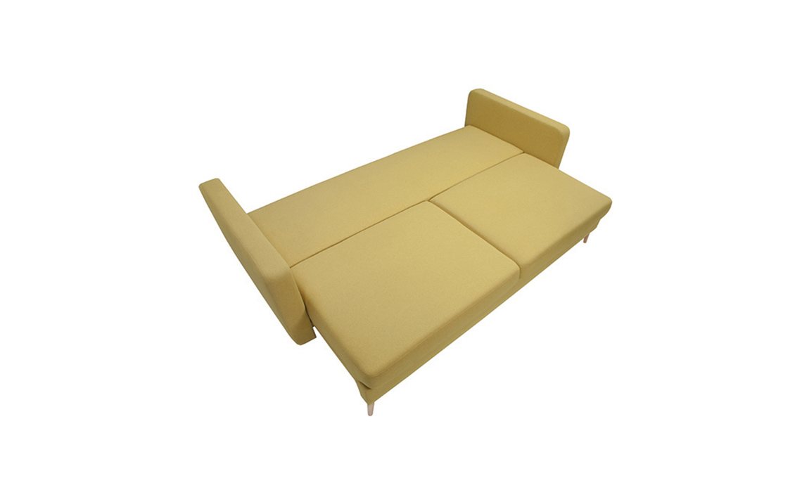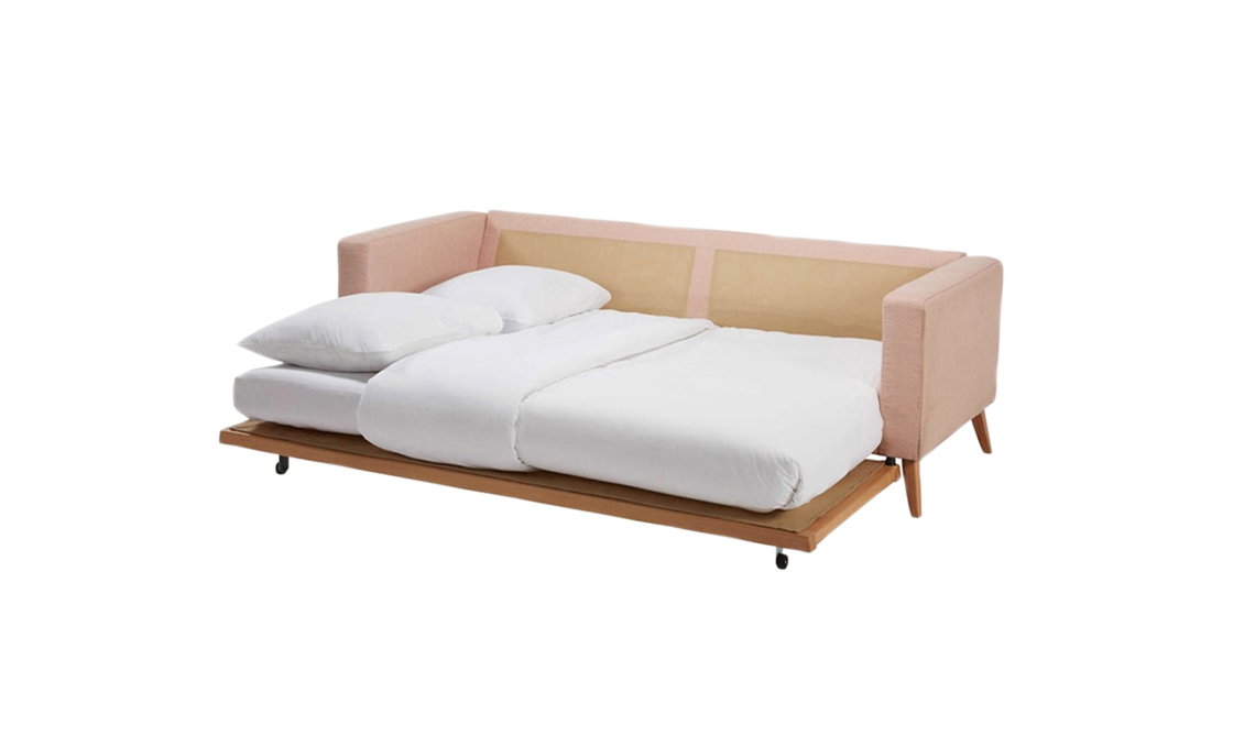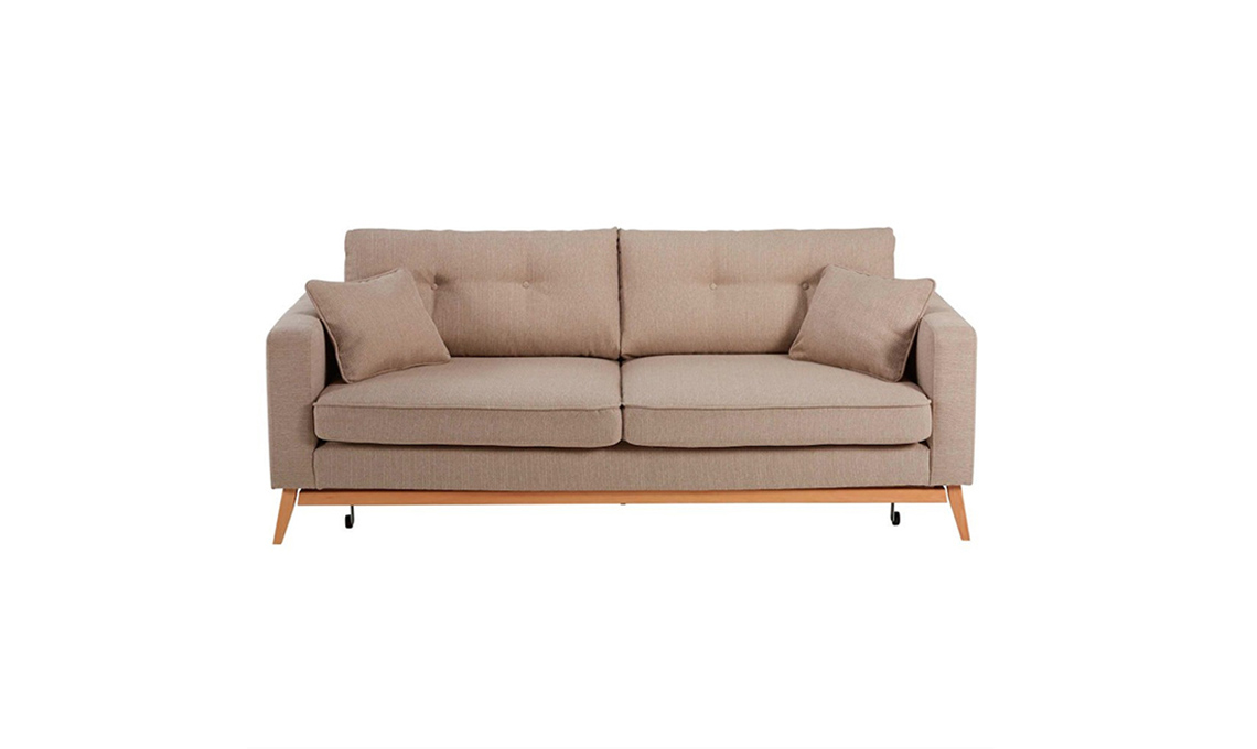 Il sofà Brooke diventa letto a una piazza e mezza estraendo il pianale e ribaltando la seduta in schiuma poliuretanica [Maisons du Monde].