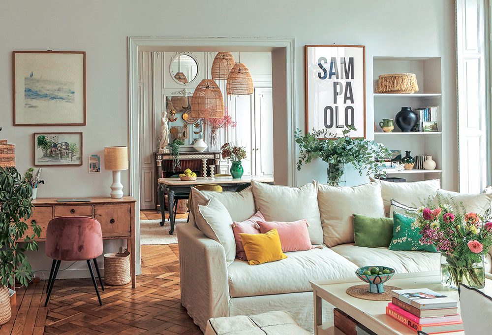 Il segreto sta nel giusto mix, così il divano romantico è abbinato a elementi decorativi in legno e rattan.