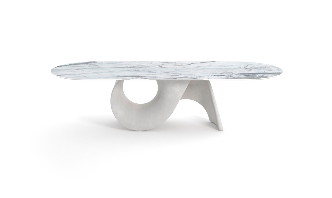 Scenografico. Piano ellittico in ceramica effetto marmo per Seashell, dal basamento scultoreo in cemento bianco [Calligaris]