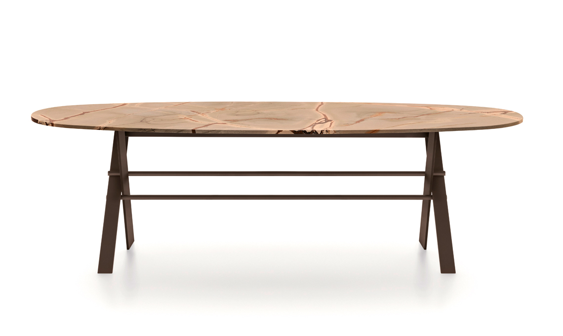 Intrecci geometrici. Dotato di una base a X in metallo che incrocia un doppio tubo, XCS qui ha il piano di marmo Spiderman [Ditre Italia, cm 210x110x73h]