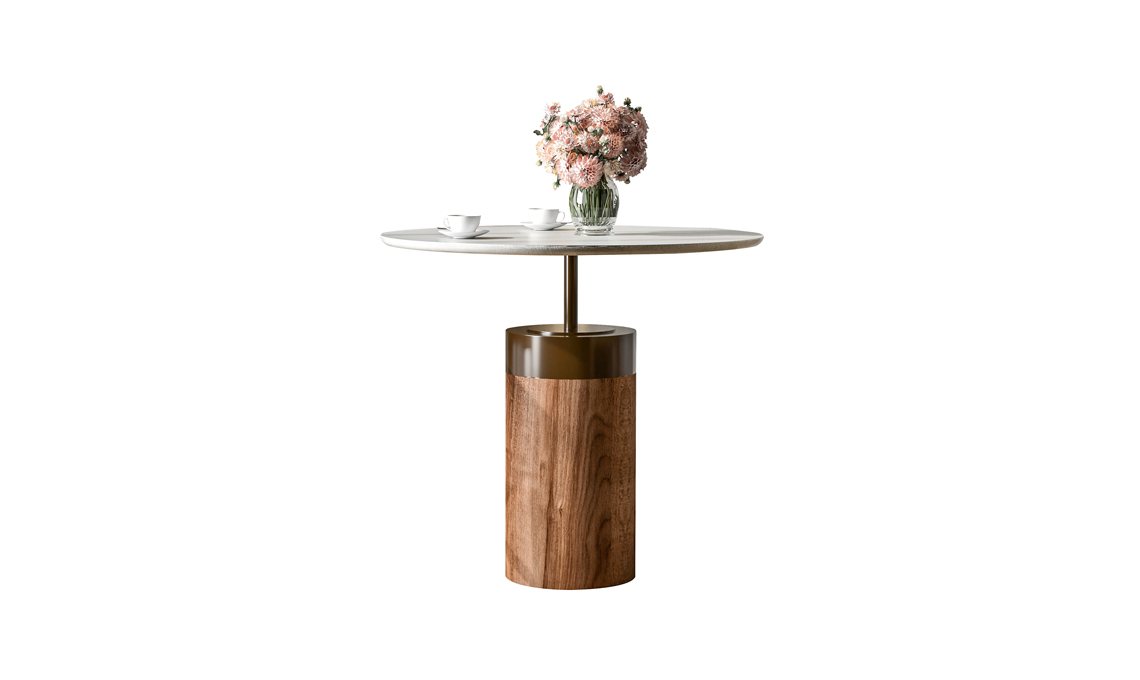 Come al bar. Qui con base in noce, telaio Brown e piano in finitura Carrara, il tavolo Bar puoi averlo in materiali e finiture varie [Giessegi, ø cm 110x100h]