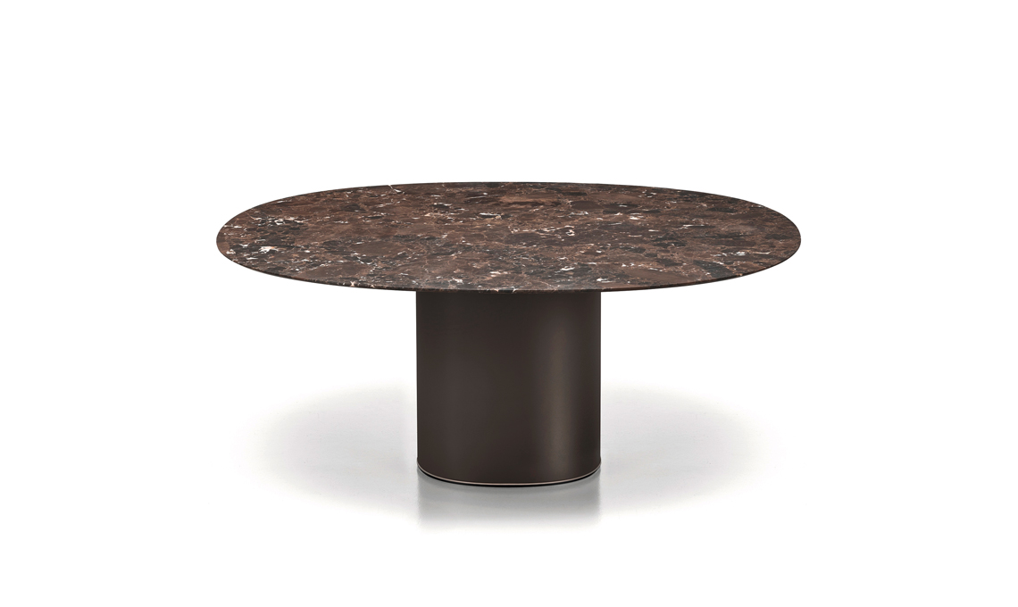 Ovale d'impatto. Il segno distintivo di Holo Pillar è la base massiccia su cui poggia il piano ovale in marmo Emperador Dark [Kristalia, cm 179x159x75h]
