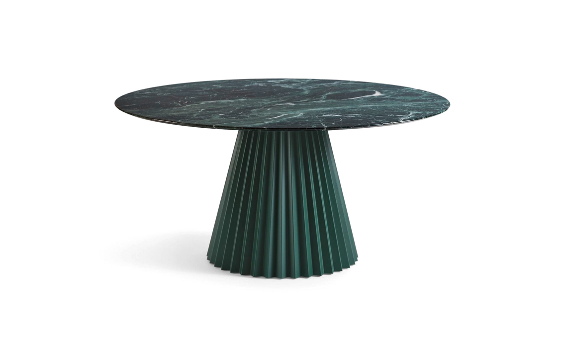 Base plissettata. Dotato di piano in marmo verde Tinos, Plissè ha la base in metallo verde scuro che ricorda le pieghettature di un tessuto [Midj, ø cm 150x75h]