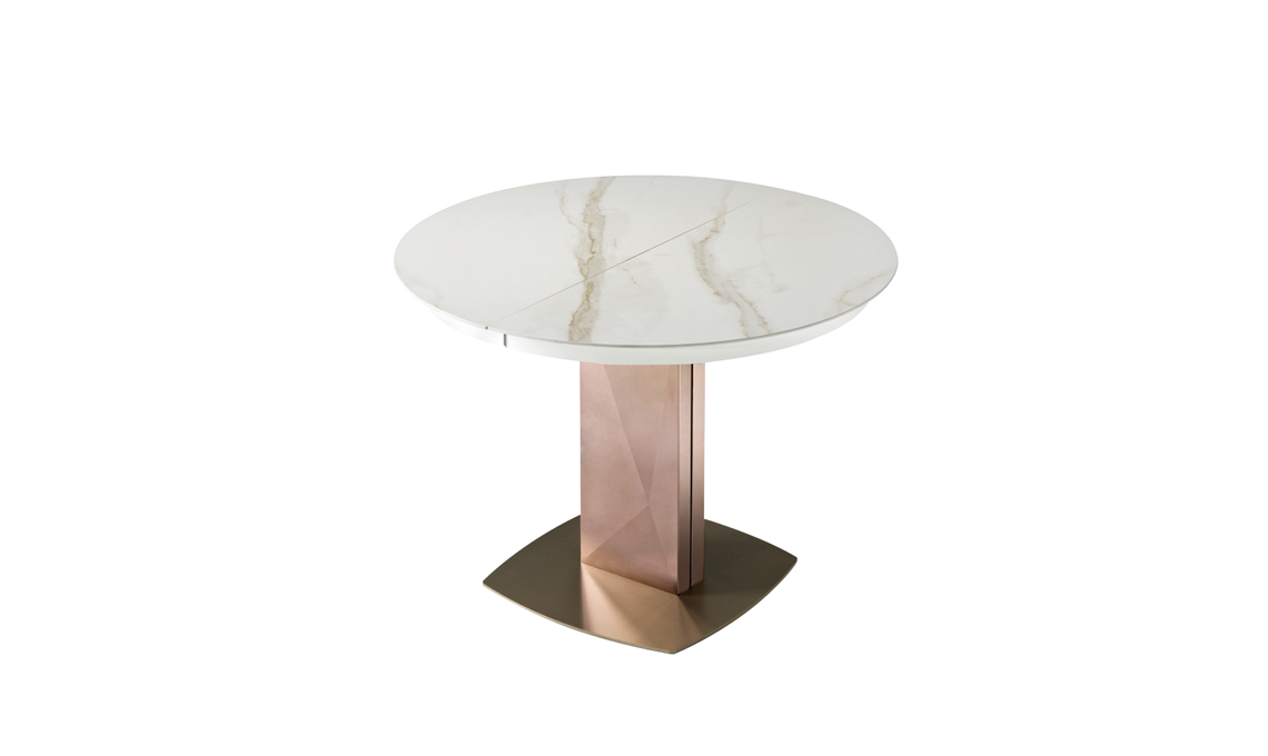 Da tondo a ovale. Con piano allungabile in ceramica, Sabino ha la base rivestita in acciaio specchiante nel colore Rose Gold [Riflessi]