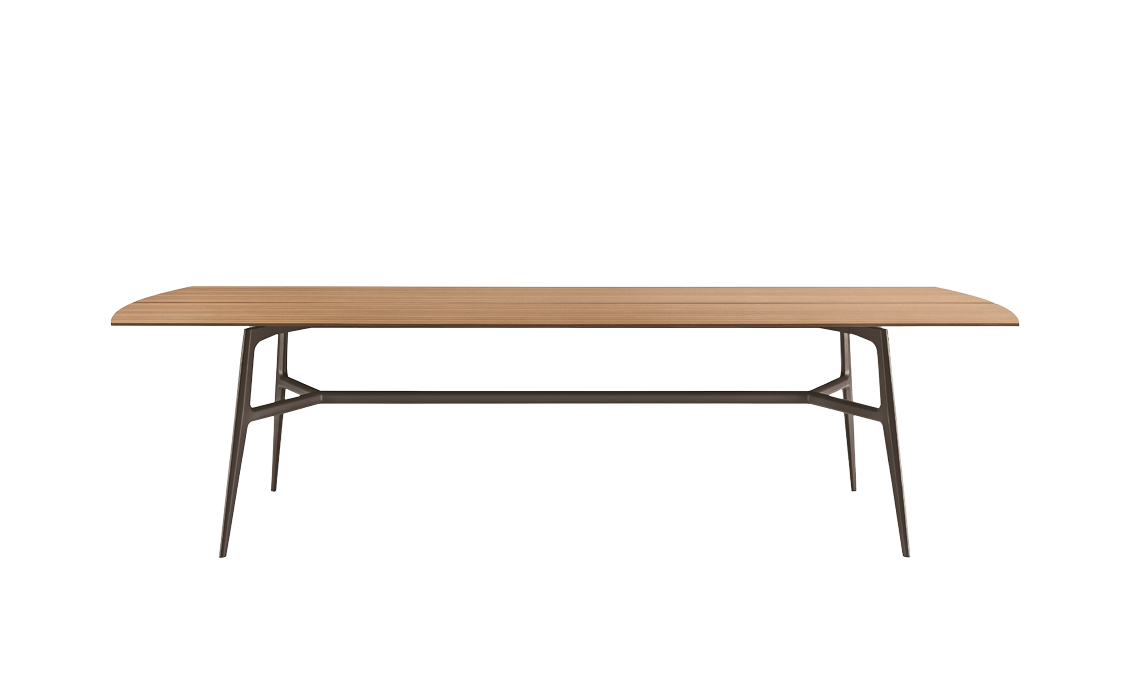 Maxi eleganza. Francis ha il top in noce con fessura centrale e bordi stondati. La base è in alluminio lucido nero [Rimadesio]