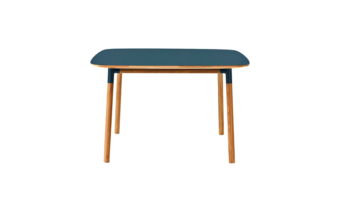 Resiste ai graffi. Form Table ha la struttura in legno di rovere e il piano rivestito in linoleum blu opaco [Normann Copenhagen da TaniniHome, cm 120x120x74,4h]