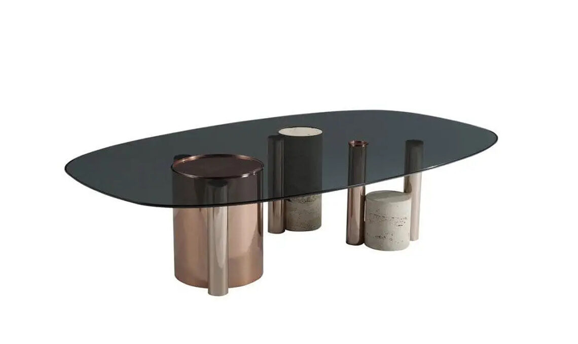 Base in marmo e acciaio nel tavolino Silo [Roche Bobois, cm 146x88x35h]