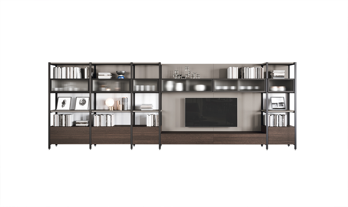 - la libreria Pontile ha montanti in alluminio estruso brunito che accolgono un listello frontale e ripiani a varie altezze; qui con contenitori base Box 18 [Novamobili].