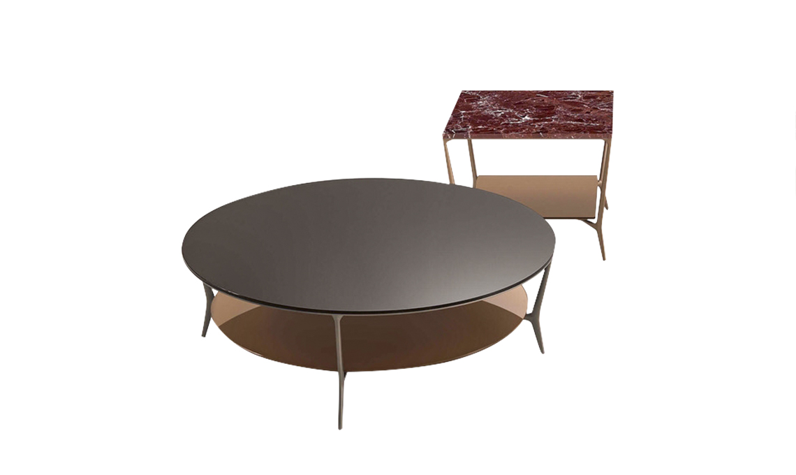 - i tavolini Planet sono in alluminio finitura rame e top in marmo Rosso Lepanto, il quadrato; finitura bronzo e top in vetro moro lucido il tondo [Rimadesio].