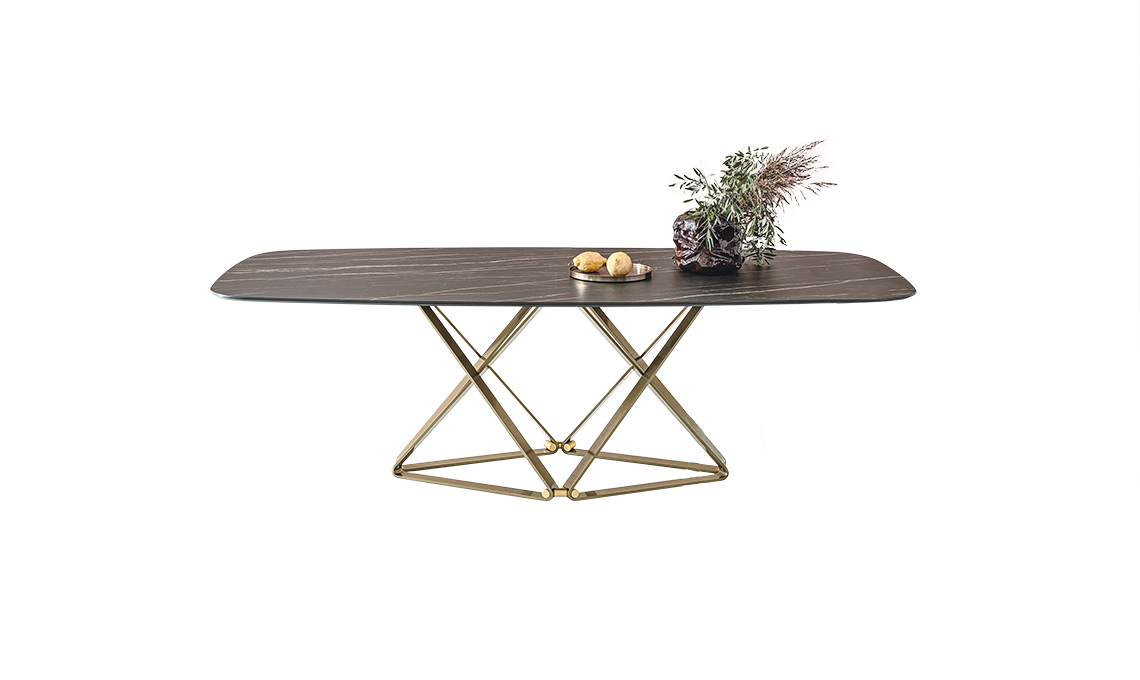 - il tavolo Delta ha la base in ottone anticato con dettagli decorativi oro e il piano a botte in supermarmo noir desir opaco [Bontempi Casa].