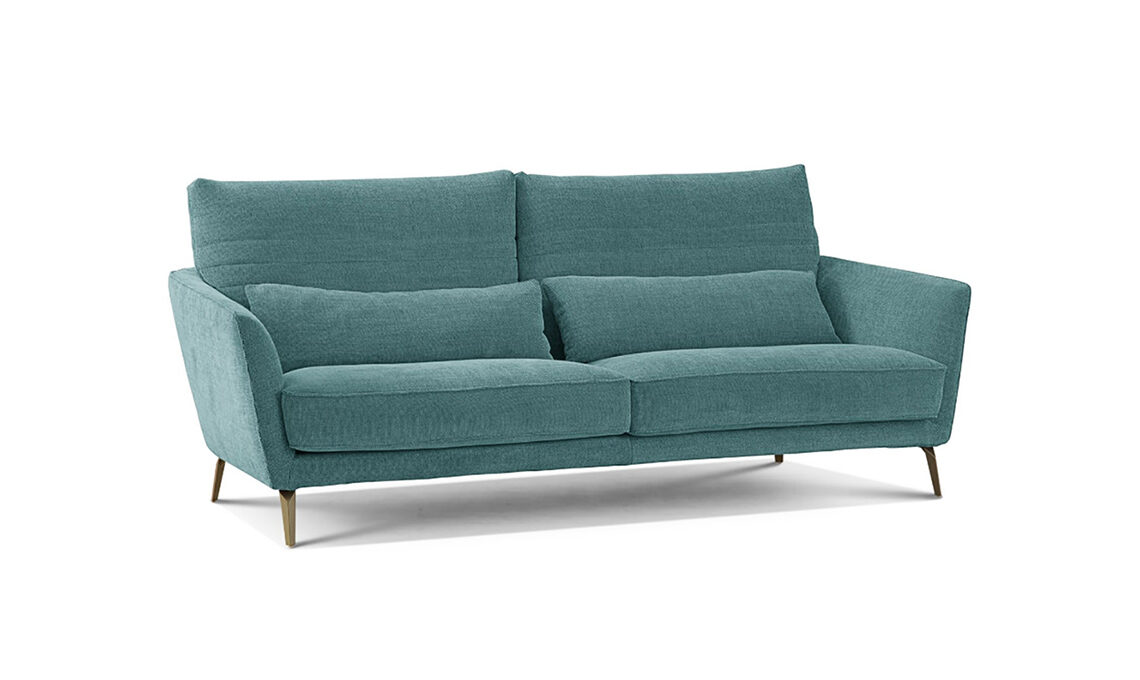 Poltrona Geo, su base con finitura ottone satinato [Saba Italia, cm 90x82x78h da € 2.250].