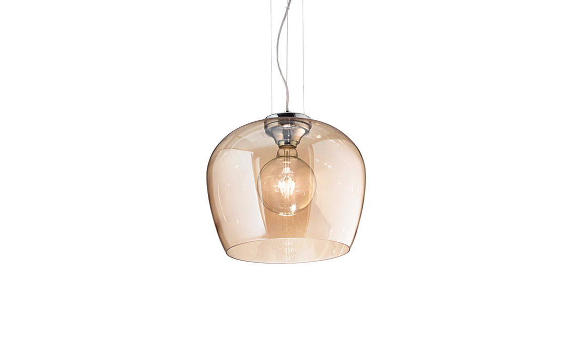 la sospensione Blossom, dal diffusore in vetro soffiato trasparente, qui è in finitura ambra che richiama la forma di un tulipano [Ideal Lux].