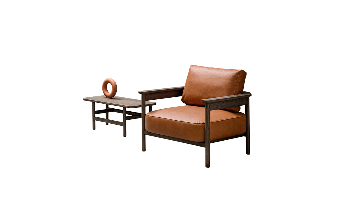 la poltrona dalla struttura in rovere Siena Hood, in questa versione ha i morbidi cuscini di seduta e schienale rivestiti in pelle [Zanette].