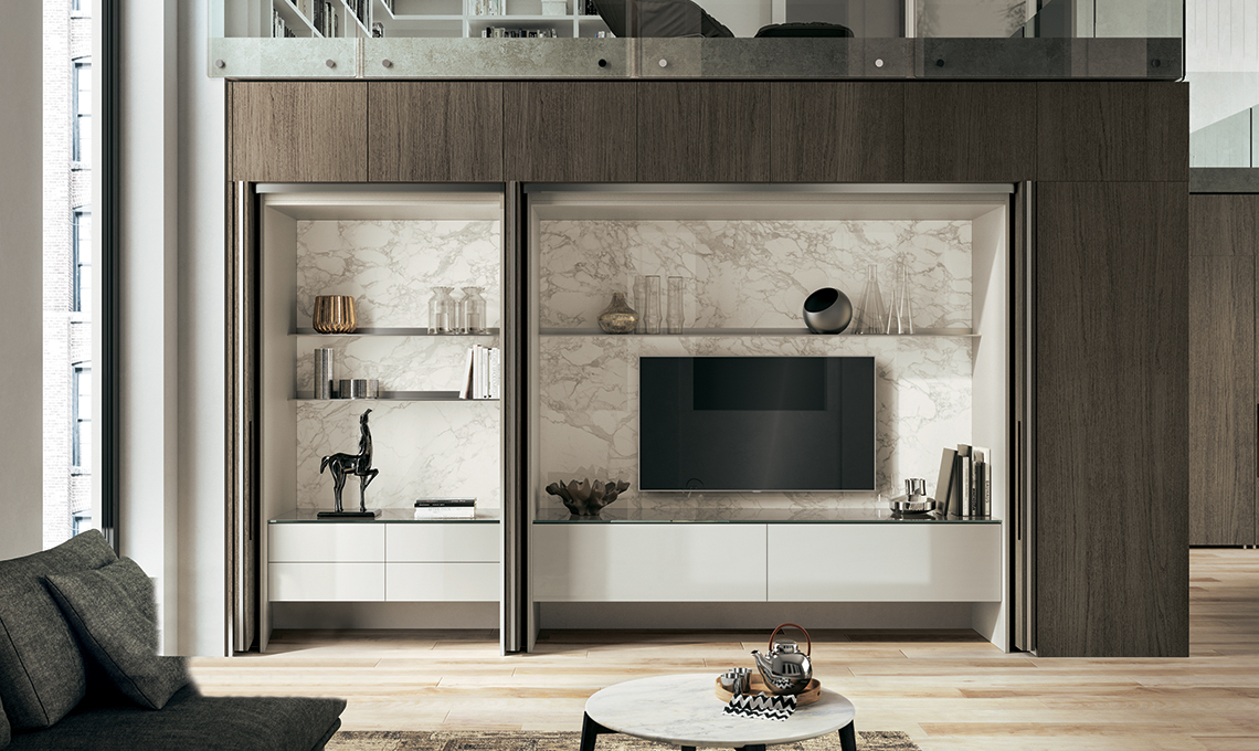 la parete contenitore BoxLife nasconde, dietro le ante in decorativo Rovere, moduli con cassettiere in laccato opaco Grigio Chiaro e schienali in Gres Arabescato lucido [Scavolini].