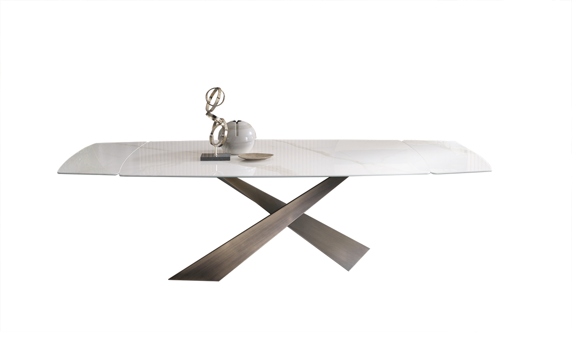 Il tavolo Living ha la base in ottone spazzolato a mano e il top in ceramica bisellata stratificata Calacatta, su vetro da 12 mm con angoli smussati [Riflessi].