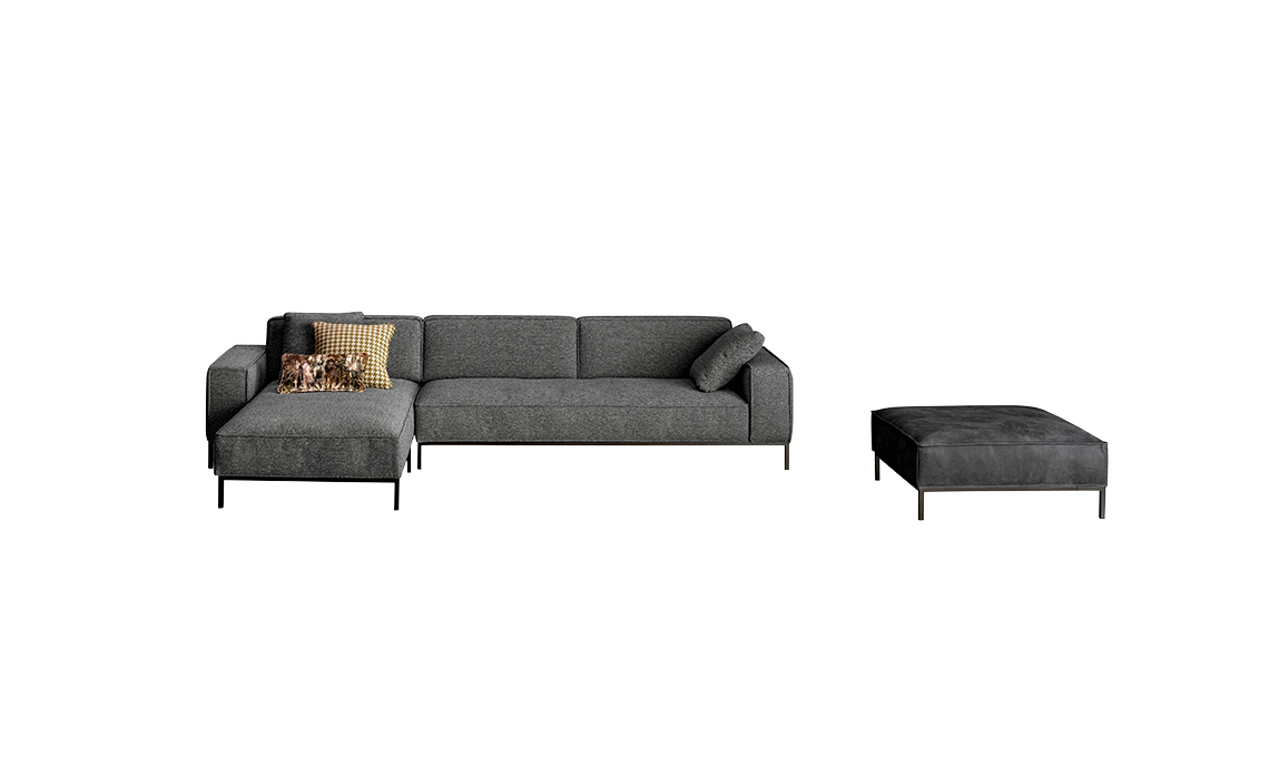 Ampia seduta per il divano tessile Loft, con chaise longue e pouf abbinati [Twils Lounge, cm 350x95-135x95h da € 5.880 il divano e € 1.235 il pouf cm 95x95x39h].