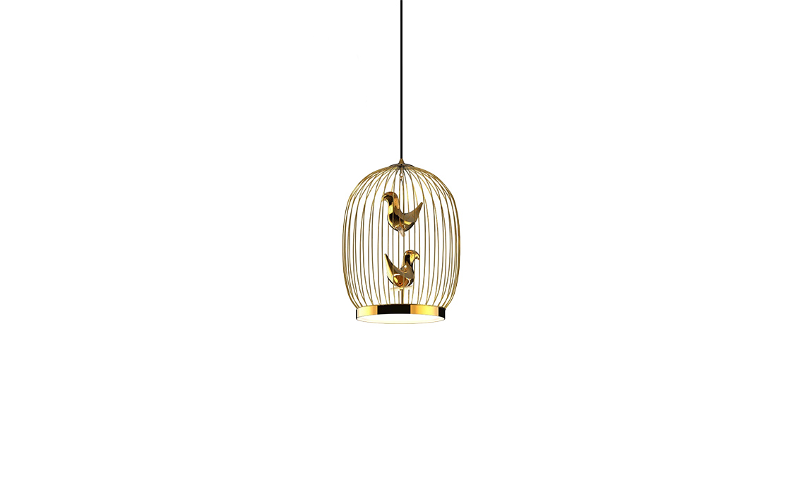 A forma di gabbia la lampada Twee T. in tondino metallico dorato e uccellini in ceramica [Horm, ø cm 41x56h € 2.232].
