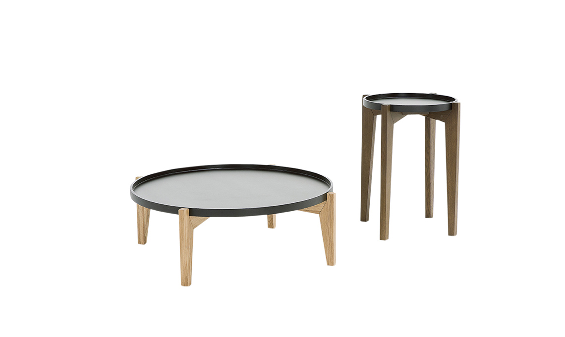 In legno, con piani-vassoio i tavolini Globen [Egoitaliano, da ø cm 46x60h da € 626].