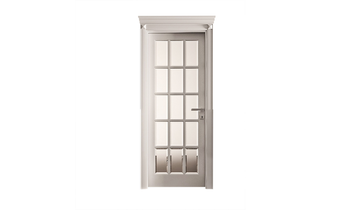 In stile classico la porta in legno laccato e vetro satinato Dorè [Garofoli € 1.308].