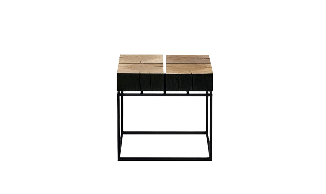 Due blocchi di rovere massiccio e una leggera struttura metallica nel tavolino Etna [Roche Bobois, cm 41x41x39h € 1.150].