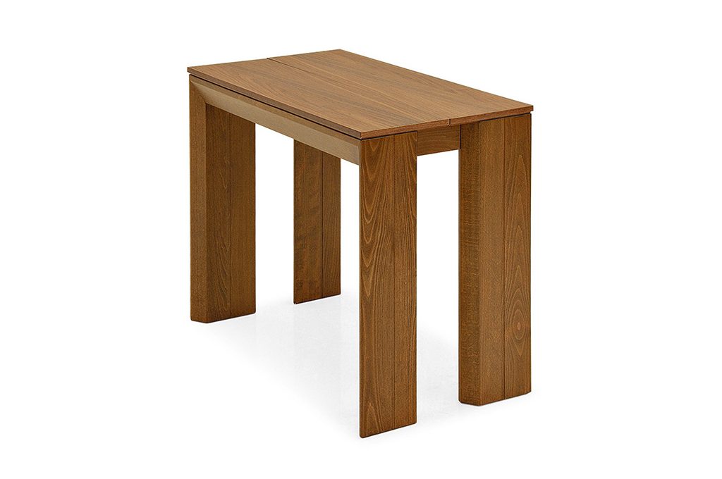 La consolle allungabile in legno finitura noce Mistery diventa in un baleno un tavolo da pranzo [cm 49/200x90x75h €941]. Sedie pieghevoli in alluminio Skip [cm 47x 5/51x80/91h €114,50/pz, tutto Calligaris].