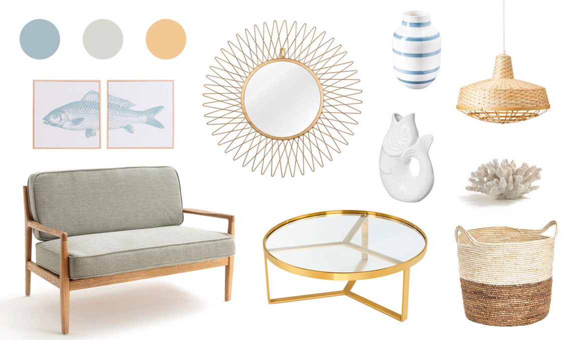 Da amante dello stile naturale, ho creato una moodboard composta da complementi d'arredo raffinati e chic, caratterizzati da una palette di colori caldi e delicati, che richiama la naturalezza delle fibre naturali, l'azzurro del mare e un tocco dorato per rendere il tutto più scintillante.