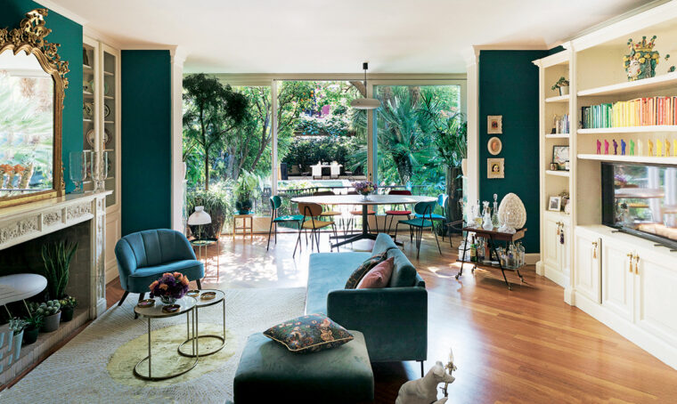 Un divano blu, una poltrona neutra, un tappeto nei toni del grigio e un tavolino dorato: aggiungi tessuti per scaldare e quadri contemporanei, per uno stile che non ti stancherà molto presto!